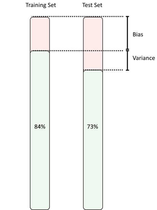 We can look at bias and variance visually by comparing the performance of our network on the training set and test set. Recall our training accuracy of 84% and test accuracy of 73%:
